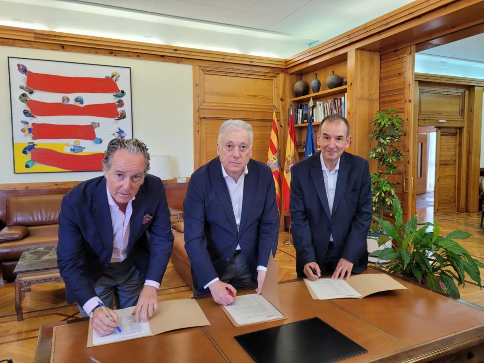 Firma del protocolo para la colaboración del Sector 90/1 en el nuevo acceso norte a Plaza a cargo del conejero Octavio López, el gerente de APL, Pedro Sas, y el presidente de la comisión gestora del Sector 90/1, Juan Manuel Alfonso.