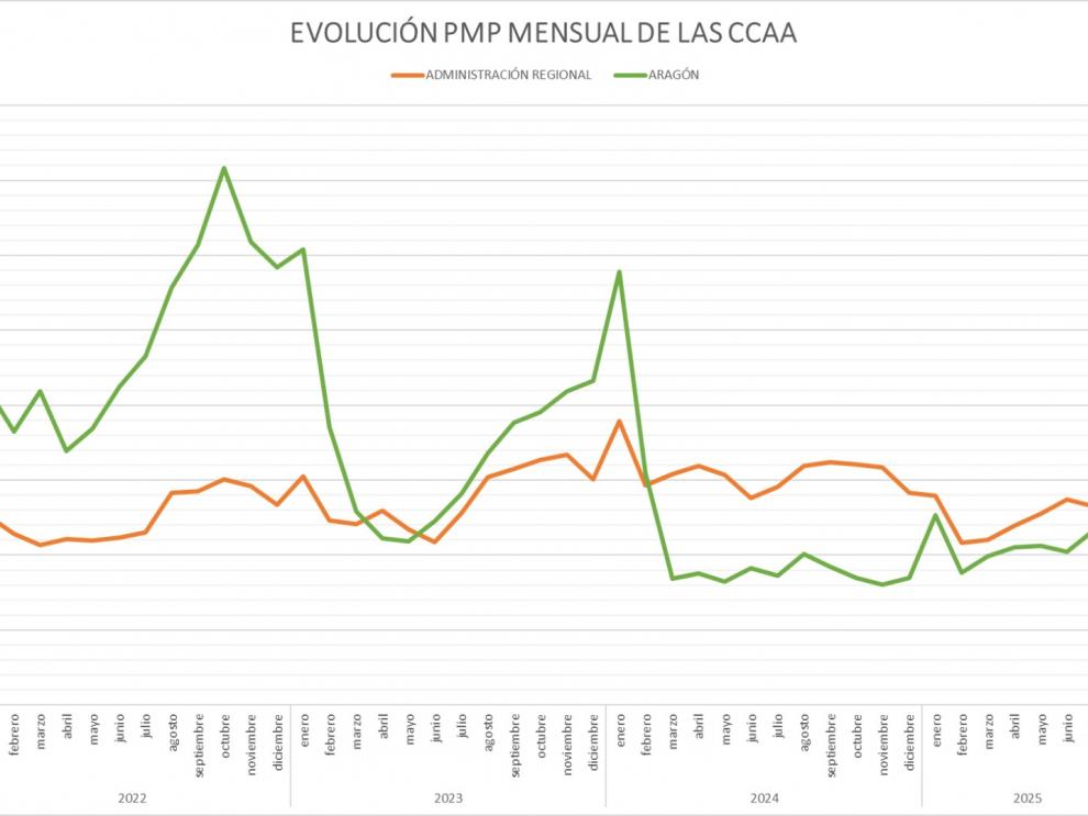 Evolución mensual de la comparativa del pago medio a proveedores de Aragón con la media nacional, según datos del Ministerio de Hacienda.